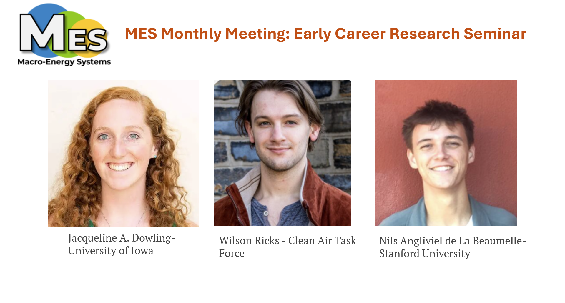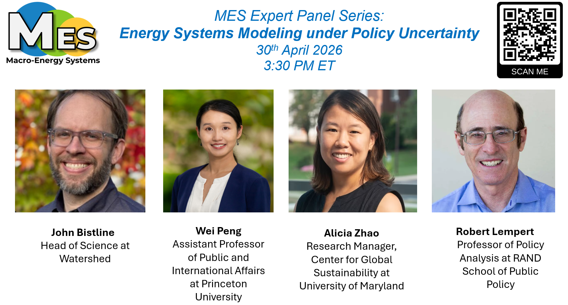 We are excited to welcome MES President Jacqueline Dowling as well as early career researchers Wilson Ricks and Nils Angliviel de la Beaumelle. They will present their research on long-duration energy storage, offshore wind, and enhanced geothermal power, respectively.